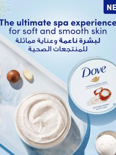 Dove Exfoliating Body Polish Scrub,Macadamia & Rice Milk,with ¼ moisturising cream, 225ml