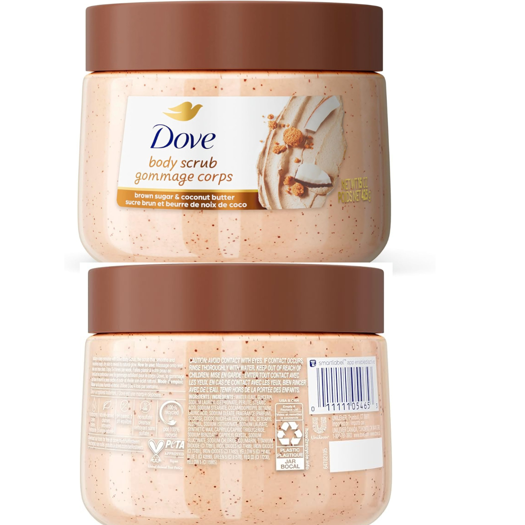 There’s one essential step for achieving smooth skin that shouldn’t be overlooked: exfoliation. So, gently buff away dry, dull skin while caring for your skin with Dove Brown Sugar and Coconut Butter Exfoliating Body Scrub. Made with moisturizing cream, this gentle exfoliating body scrub restores skin’s nutrients as it exfoliates, leaving your skin feeling silky smooth. With a smooth, easily spreadable texture, this Dove body exfoliator gives you beautifully creamy coverage while releasing a gently herbal and floral hypoallergenic fragrance. Get all the effectiveness you’d look for in exfoliators or a shower scrub, but with the nourishment and care that your skin needs in the shower. To use, scoop a generous amount of Dove Brown Sugar and Coconut Butter Exfoliating Body Scrub out of the jar. Massage all over your body in circular motions for creamy coverage, and then rinse away to reveal silky smooth skin. Use 3-4 times per week as part of your skin care regimen, followed by Dove Body Wash or Beauty Bar for touchably soft skin. Try Dove Body Scrub to get beach-ready skin, prep skin for tanning, or to help exfoliate before shaving to help prevent ingrown hairs. You’ll love the feeling of silky smooth skin all over. Plus, when you buy Dove, you can be assured you’re caring for your skin with products that are PETA Cruelty-Free certified. Company-wide, we’re also on a mission to help the next generation of women develop a positive relationship with the way they look—reaching over a billion young people with self-esteem education by 2030. We’re also committed to substantially reducing plastic waste by 2025. This includes reducing our use of virgin plastic by 20,500 metric tons annually, launching new 100% recycled plastic bottles and trialing new refillable formats for certain select products.