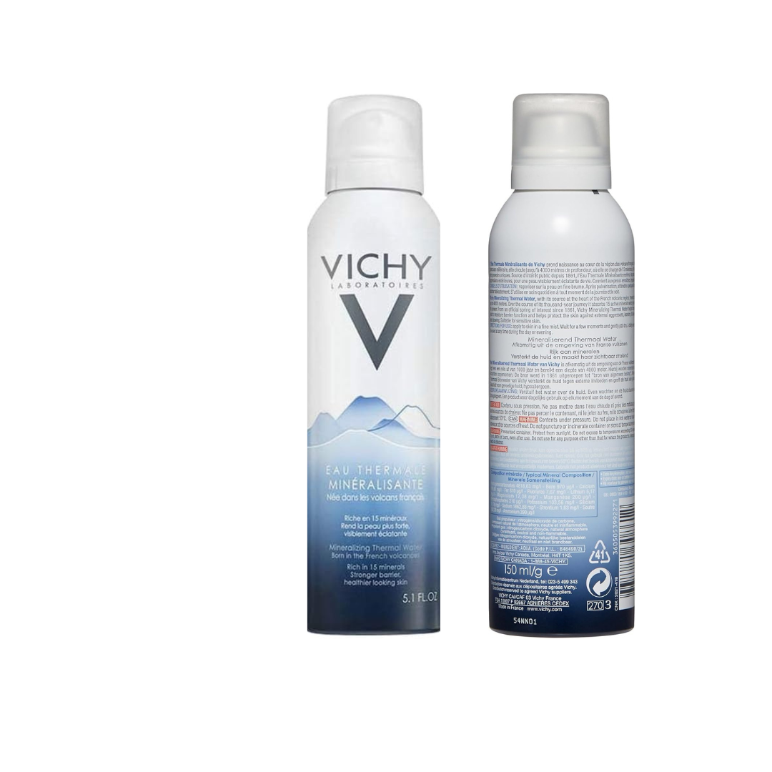 Vichy Mineralizing Thermal Water: absorbs 15 minerals. Clinically proven to strengthen skin barrier, accelerate cell renewal, soothe, & provide healthy glow. 100% pure, natural, hypoallergenic, fragrance-free.